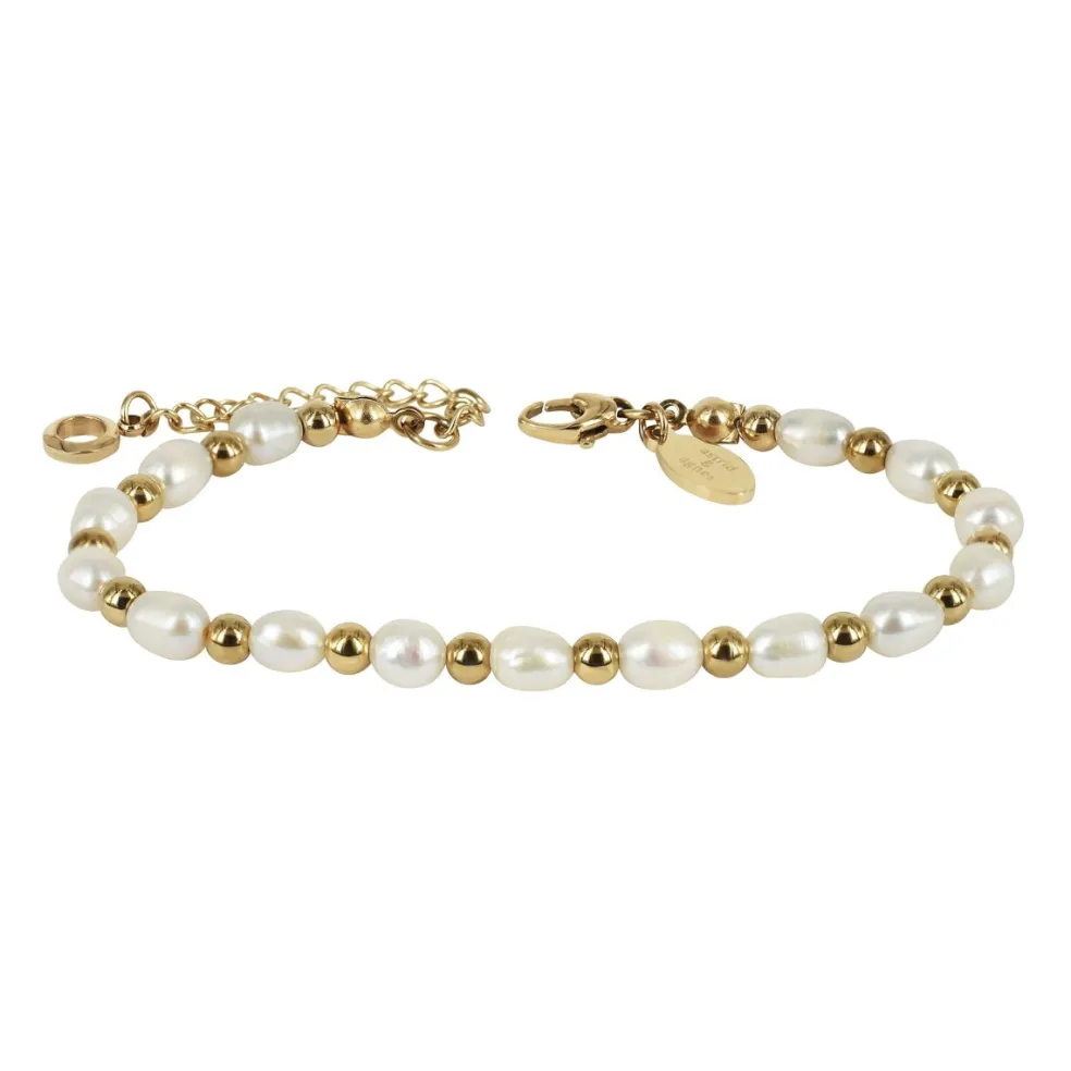Armband tillverkat med äkta sötvattenspärlor och kulor i guldpläterat stål. Då varumärket Astrid & Agnes använder sig av äkta pärlor kan form, storlek och nyans på pärlorna variera något.