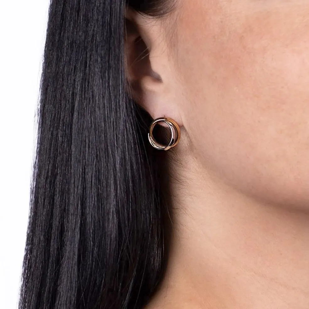 Örhänge med två sammanlänkade cirklar på, här i silver och guldfärg. Modellen kommer från varumärket astrid&agnes och deras populära serien Carolin.