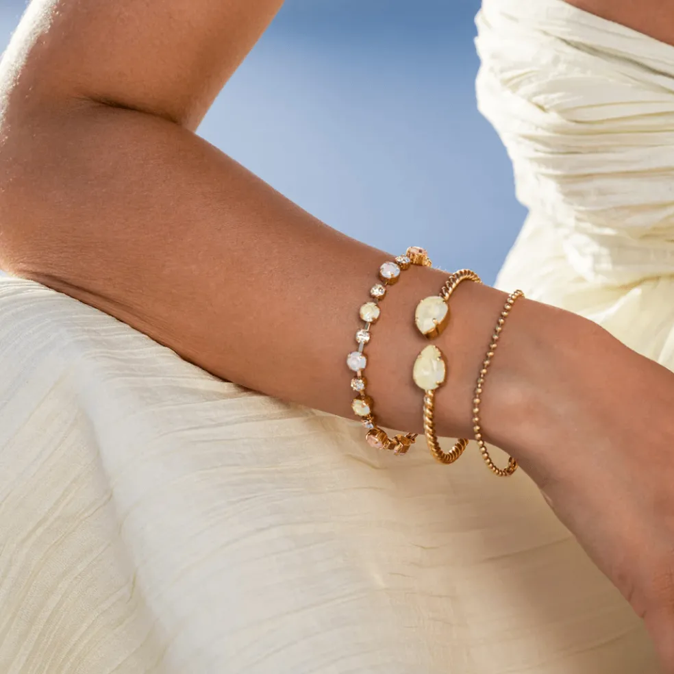 Armbandet är omsorgsfullt designat med en vacker vridning i metallen, vilket ger det en känsla av rep och tillför en unik textur som känns både modern och klassisk. Armbandet avslutas med två droppformade kristaller av högsta kvalitet.