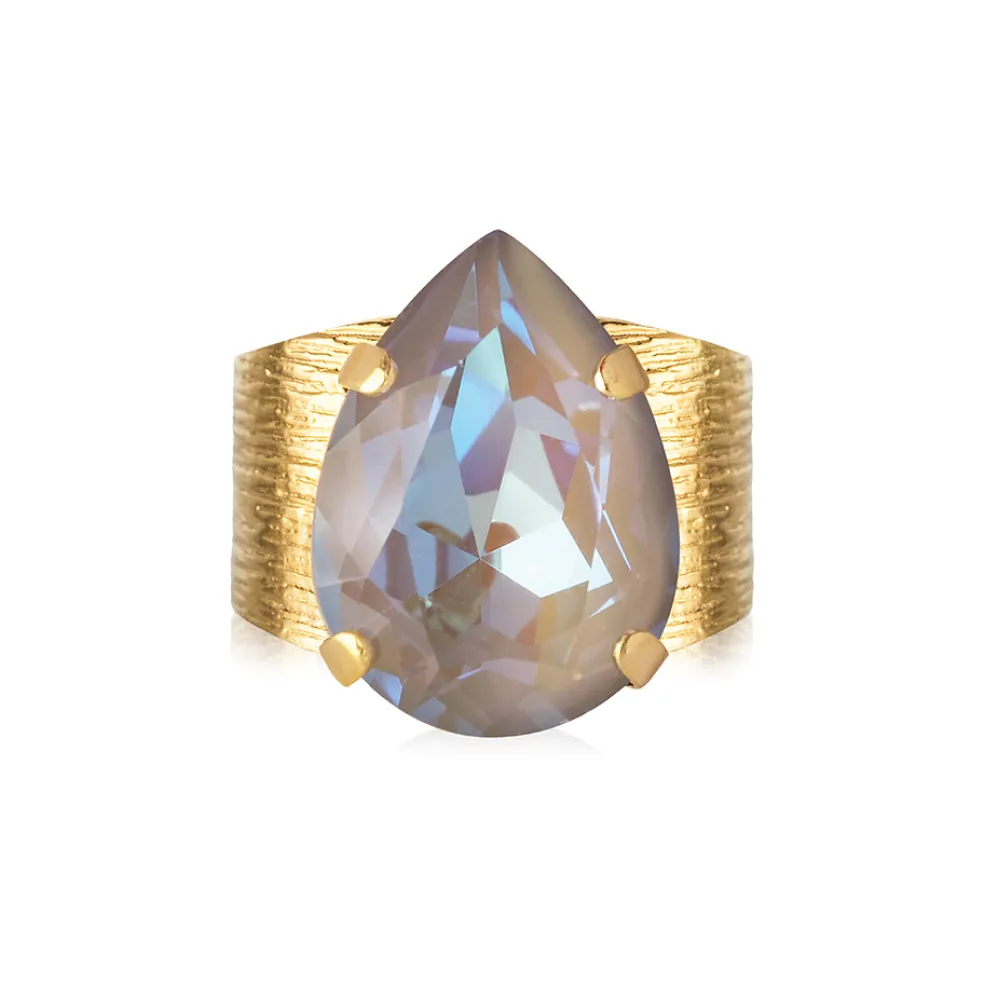 Ringen Classic Drop med sin droppformade kristall ses här i 18 karats guldplätering med den blå kristallen Serene Delite.