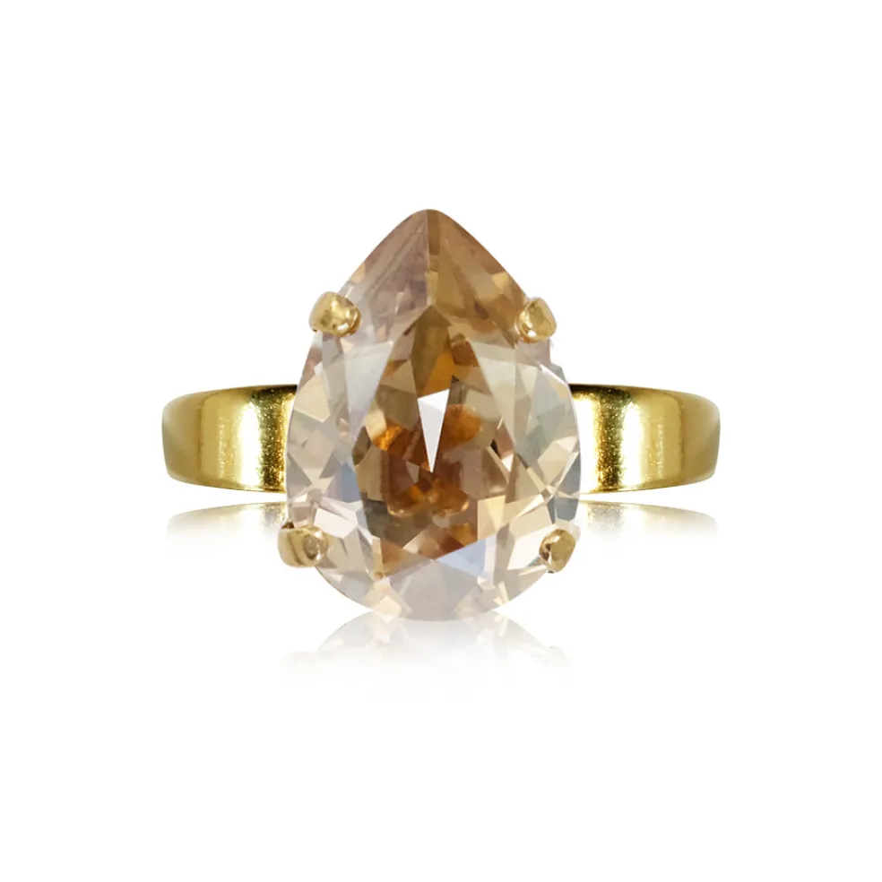 Ring av modellen Mini Drop från varumärket Caroline Svedbom med en droppformad kristall på, här i champagnefärg.
