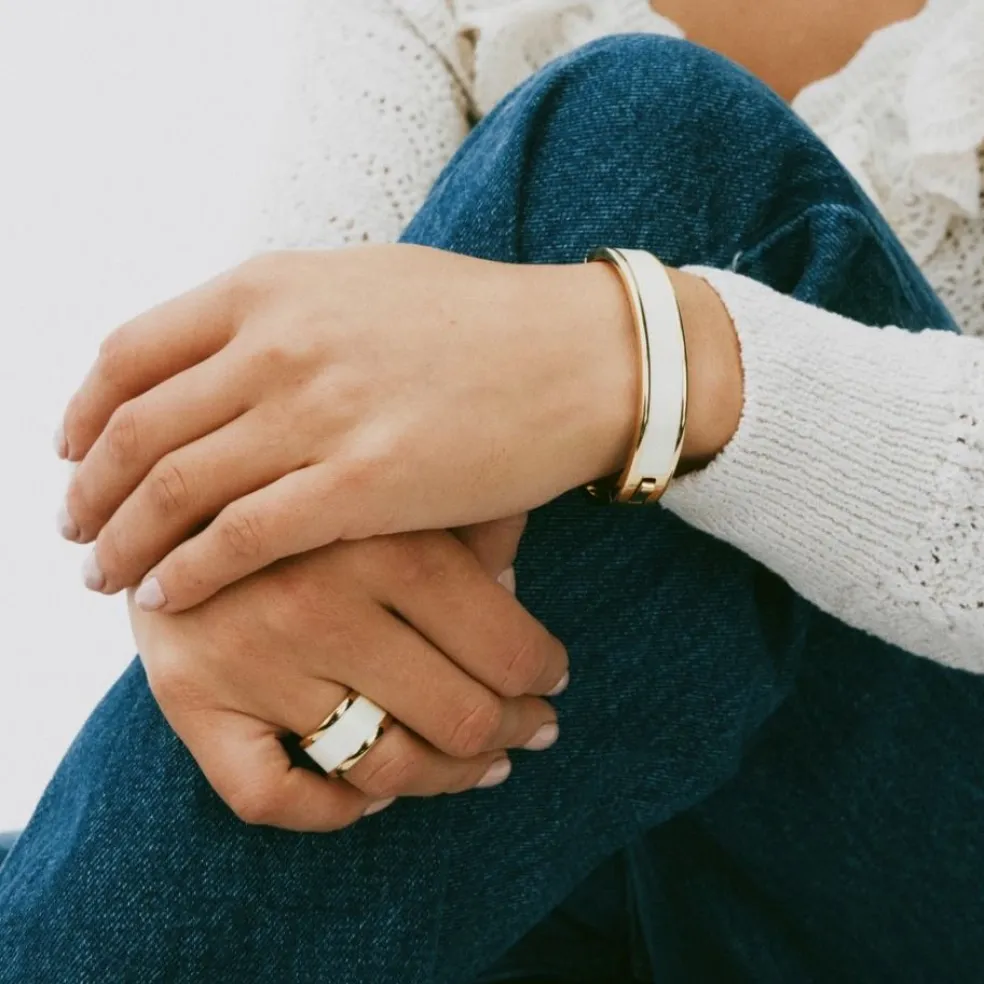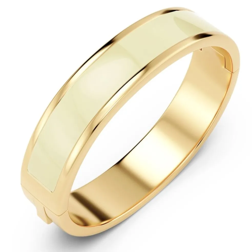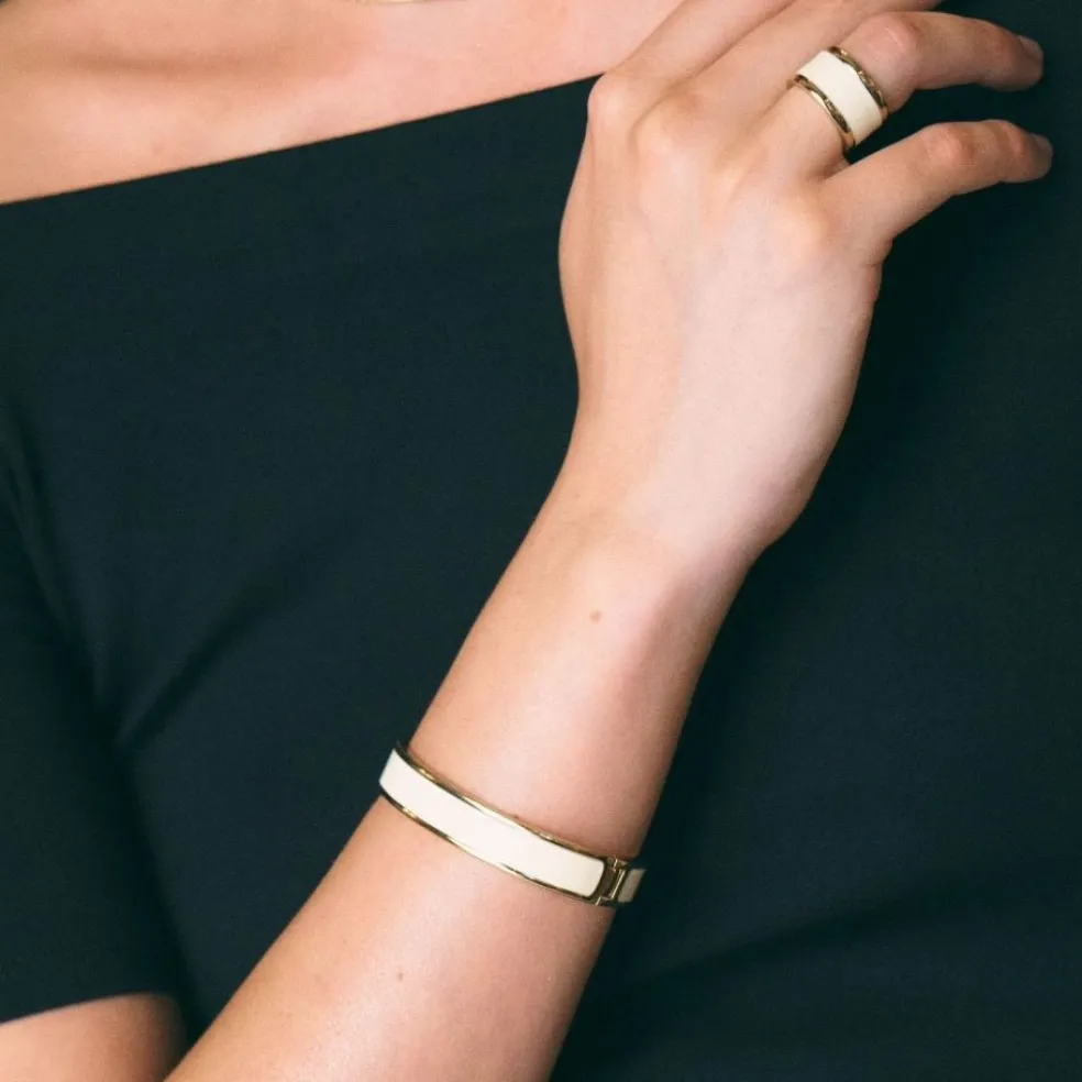 Det klassiska armbandet, här i 14K guldplätering med läcker emalj i krämig offwhite, kommer i två storlekar.