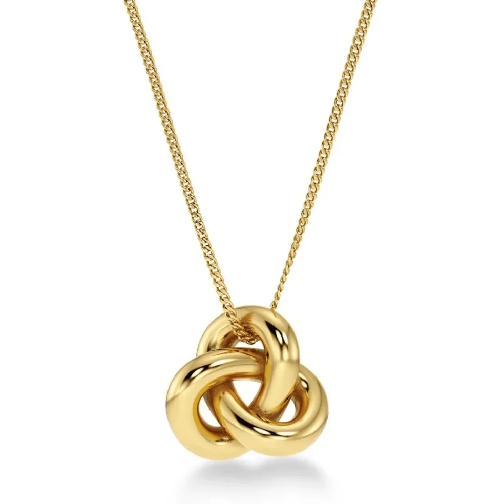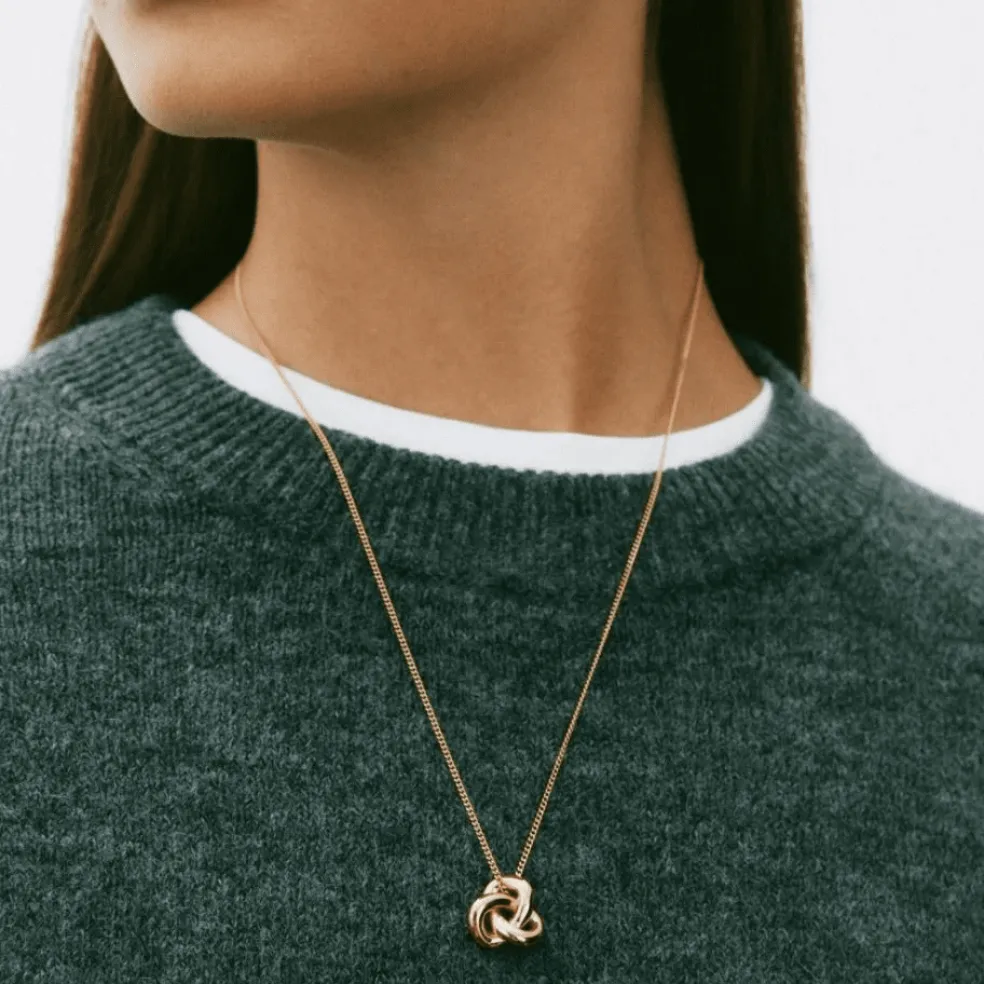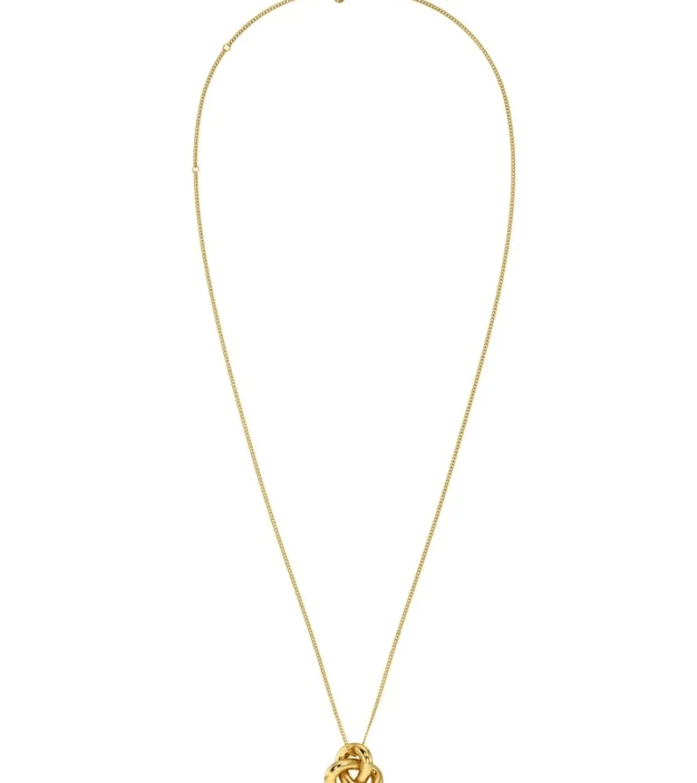 Den skulpturala evighetsknuten i serien Infinity Knot är en elegant och tidlös designikon. Med sina mjuka, obrutna linjer representerar knuten evighet och sammanhållning – en stark symbolik som passar vid livets alla tillfällen. Här presenterad som ett långt halsband i 14 karats guldplätering, där den ikoniska knuten vilar på en vackert glittrande, diamantslipad pansarkedja.