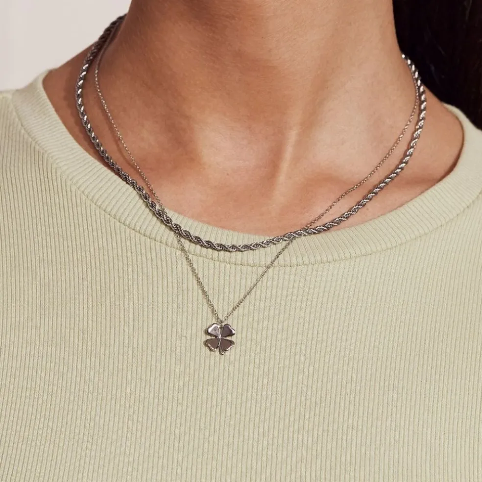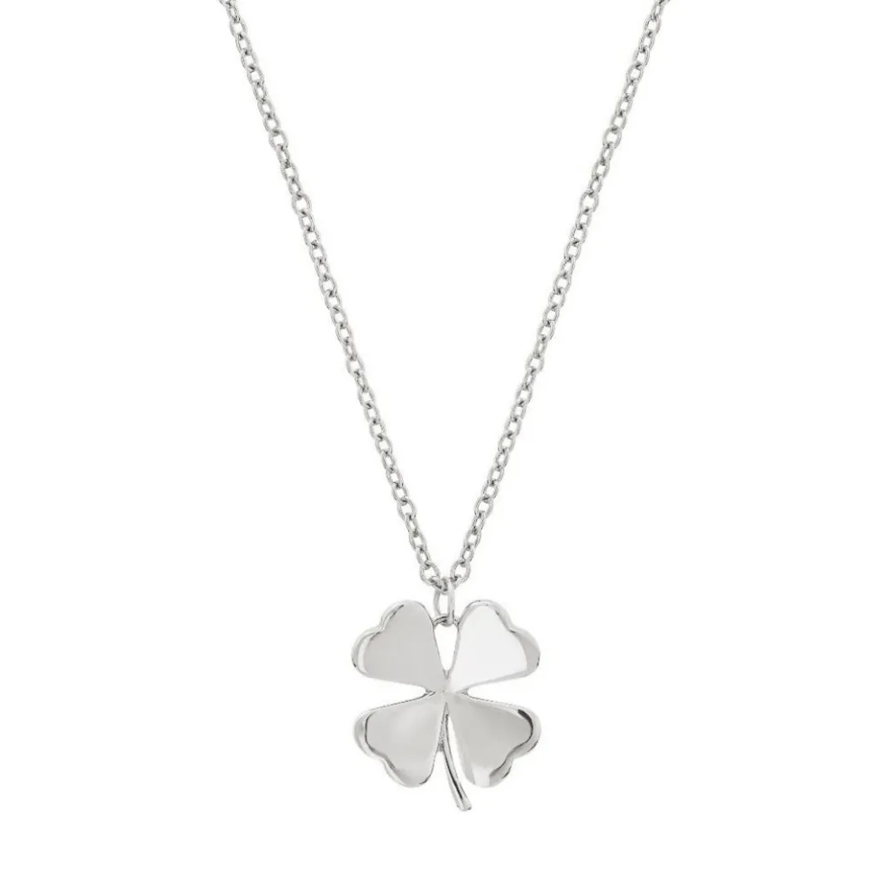 Halsbandet Lucky är en fin fyrklöver som med sina lätt välvda blad en liten kort stjälk blir en lyckobringare och följeslagare för varje dag. I Lucky halsband hänger fyrklövern i en nätt ankarkedja och ses här i blankt rostfritt stål.