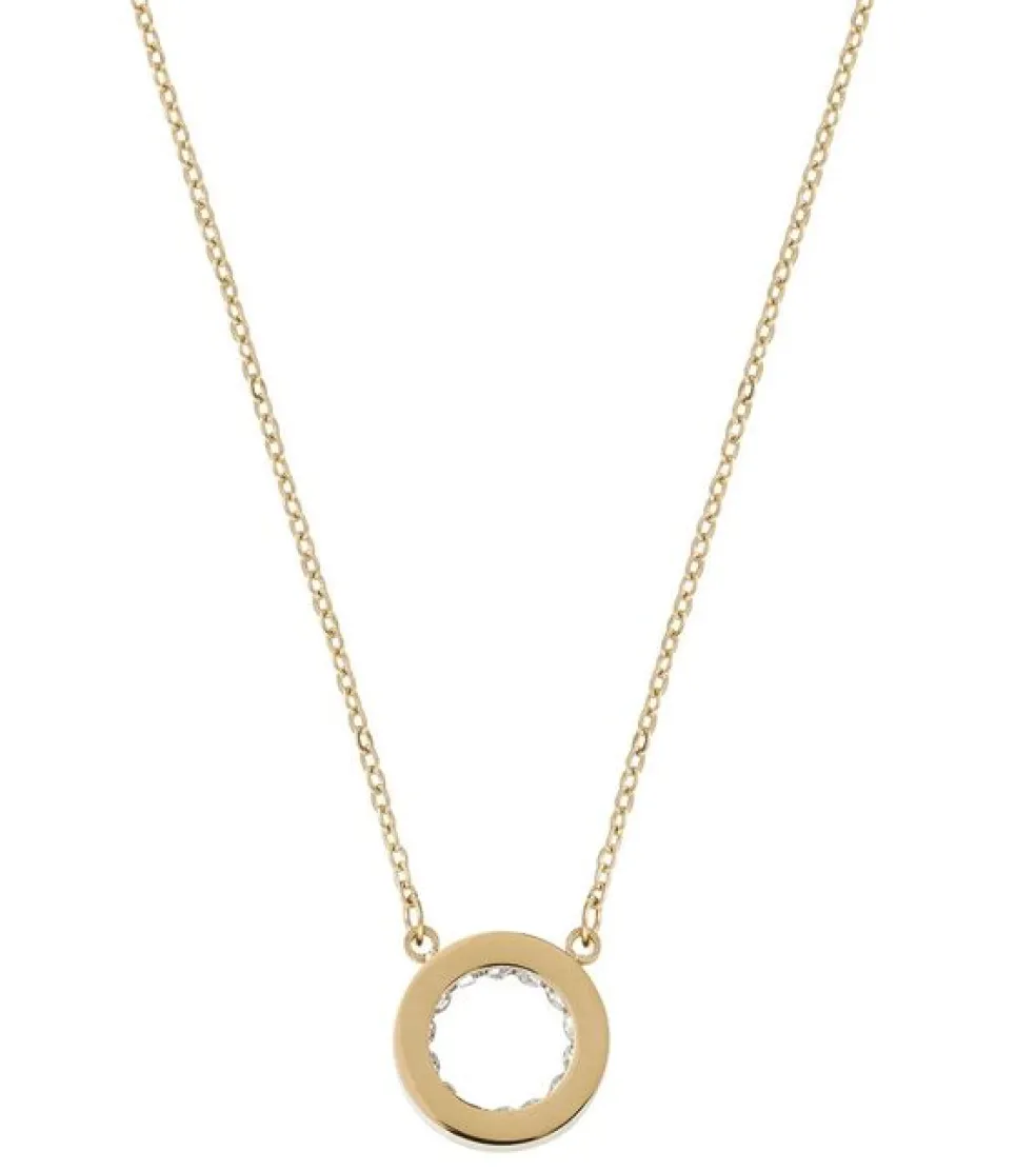 Halsband i guldpläterat rostfritt stål med tunn kort kedja samt en kristallklädd cirkel på från Edblad. Modellen heter Monaco.