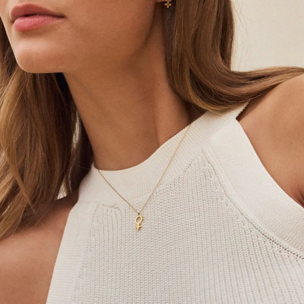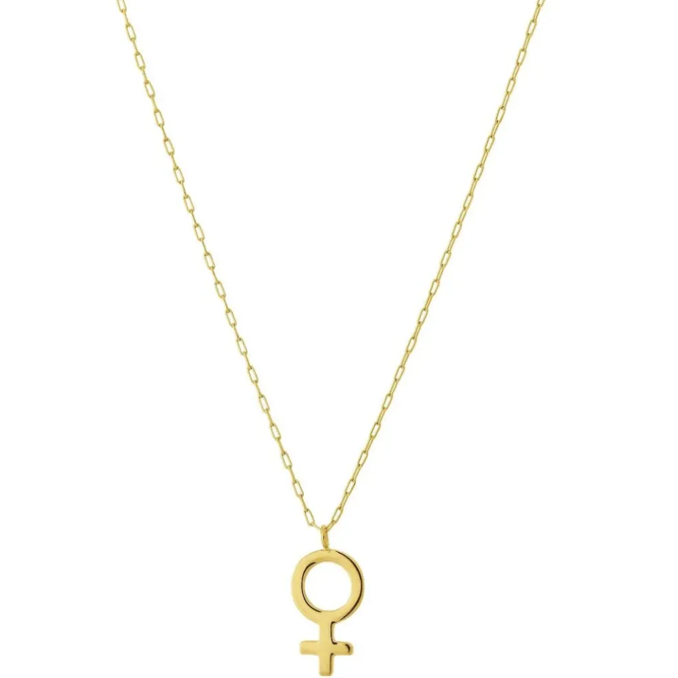 I Venus halsband hänger venussymbolen i en fin kedja med tunna rundade rektangulära länkar, här i 14 karats guldpläterat stål.