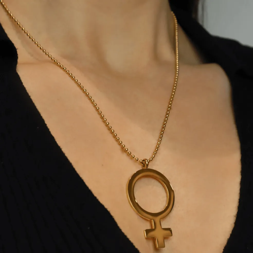 Vem är du, vad står du upp för? – Visa ditt budskap med ett halsband i guldpläterat stål med ett kvinnotecknet / kvinnosymbol på.