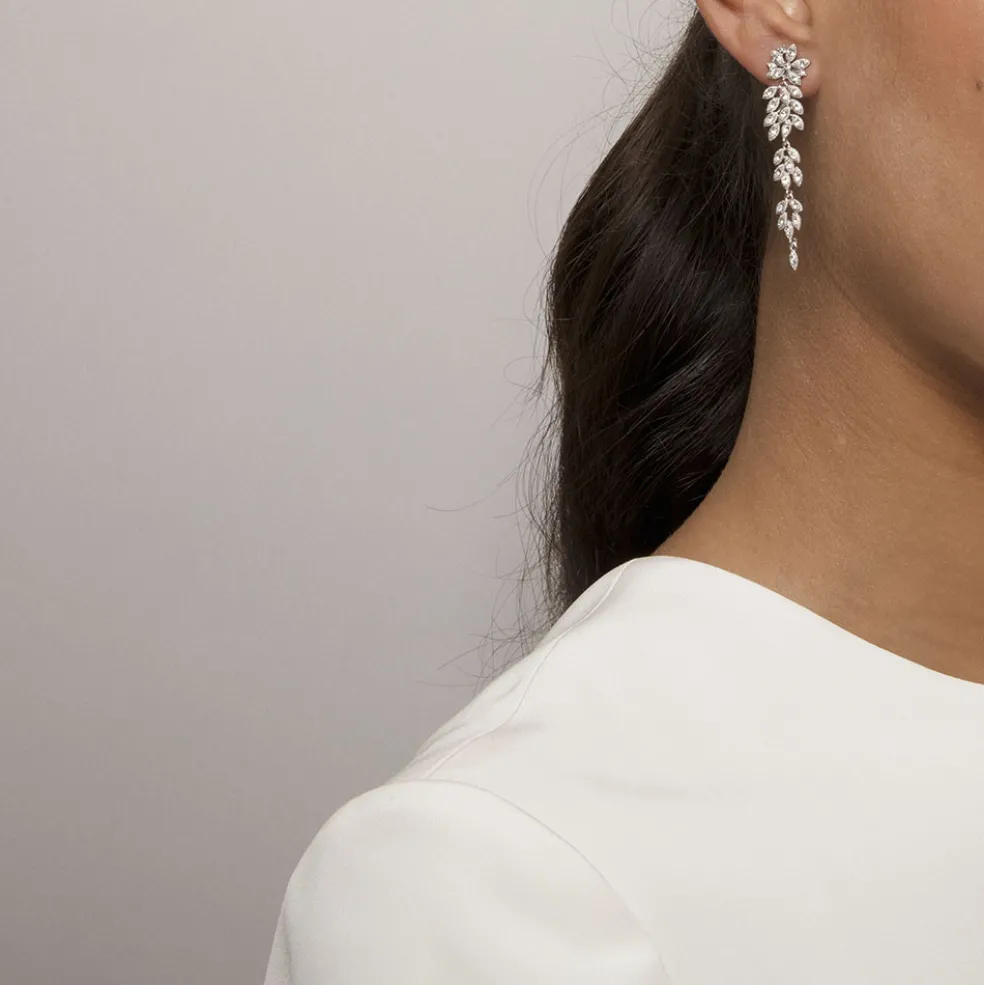 De små, diamantklara kristallerna har en nästan tredimensionell kvalitet och är arrangerade på ett sätt som garanterat kommer att imponera. Med en längd på 5,5 cm, är dessa örhängen både stilrena och iögonfallande, perfekt för att lyfta vilken look som helst.