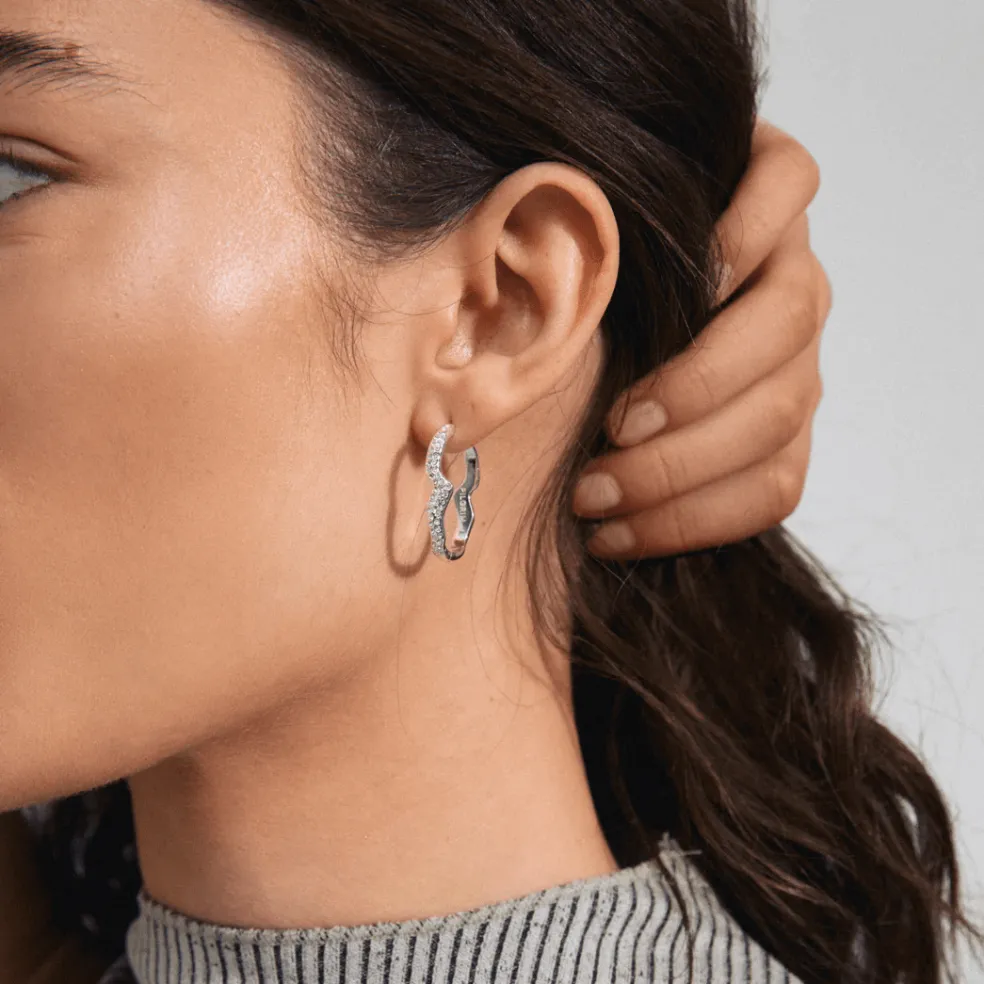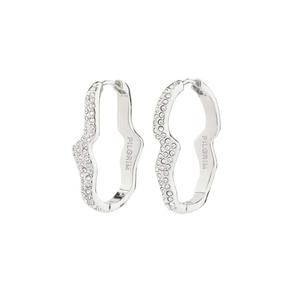 Dessa silverpläterade hoopsörhängen från Pilgrim har en mjukt vågig och organisk form, dekorerad med gnistrande Preciosa-kristaller som ger en strålande finish. Den eleganta designen tillsammans med det praktiska klicklåset gör dessa örhängen både stilfulla och bekväma att bära. Örhängena är dessutom tillverkade av 98% återvunnet material, med omtanke om miljön.