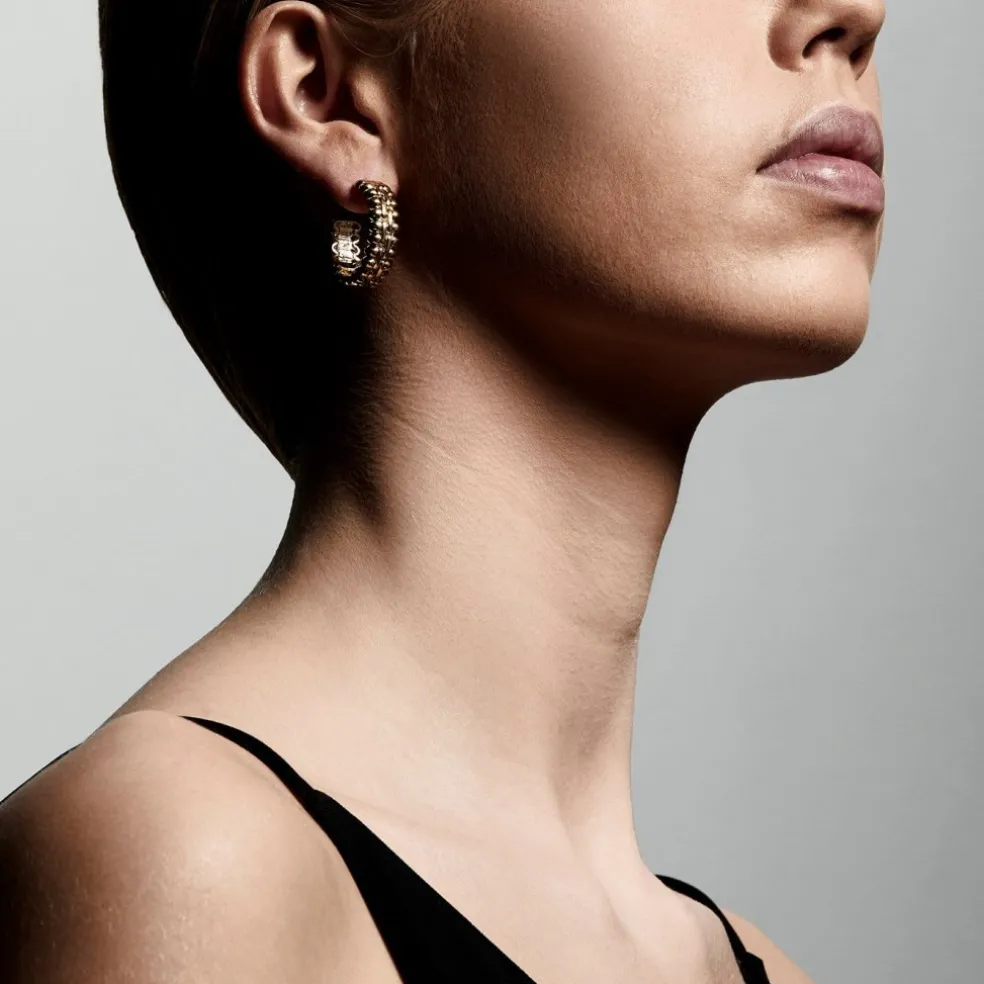 Eleganta guldpläterade örhängen med djärva silhuetter och mjuka former. Utformningen av örhängena kombinerar klassisk smyckesdesign med en modern touch och kompletterar alla moderna kvinnors utseende. Örhängena osar av femin vilja, energi och värme och hyllar alla världens starka kvinnor.