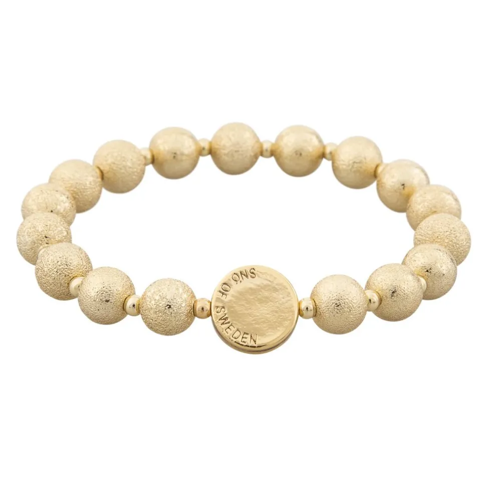 Ett elastiskt armband med 0,8cm stora kulor i matt guldfärg, modellen heter Lynx och kommer från varumärket Snö of Sweden.