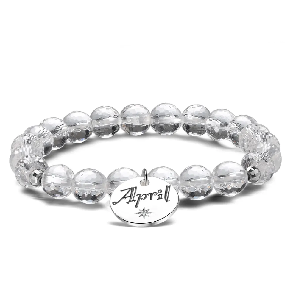 På armbandet sitter en rund bricka i äkta silver med texten April på, under texten ser Ni en klar cubic zirkon i AAAA-kvalité.