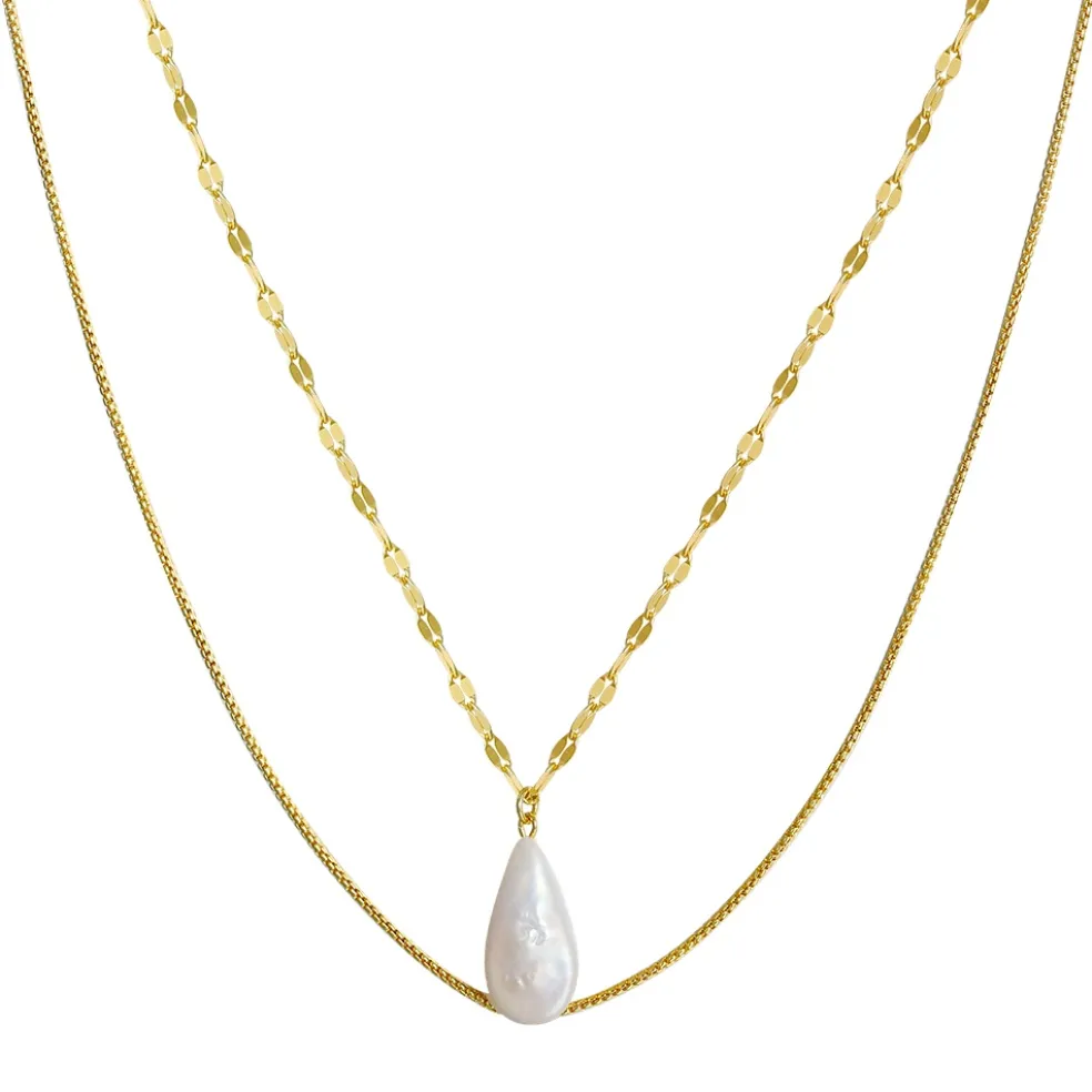 Kolla in detta eleganta halsband i dubbla rader som avslutas med en droppformad sötvattenspärla – Magiskt!