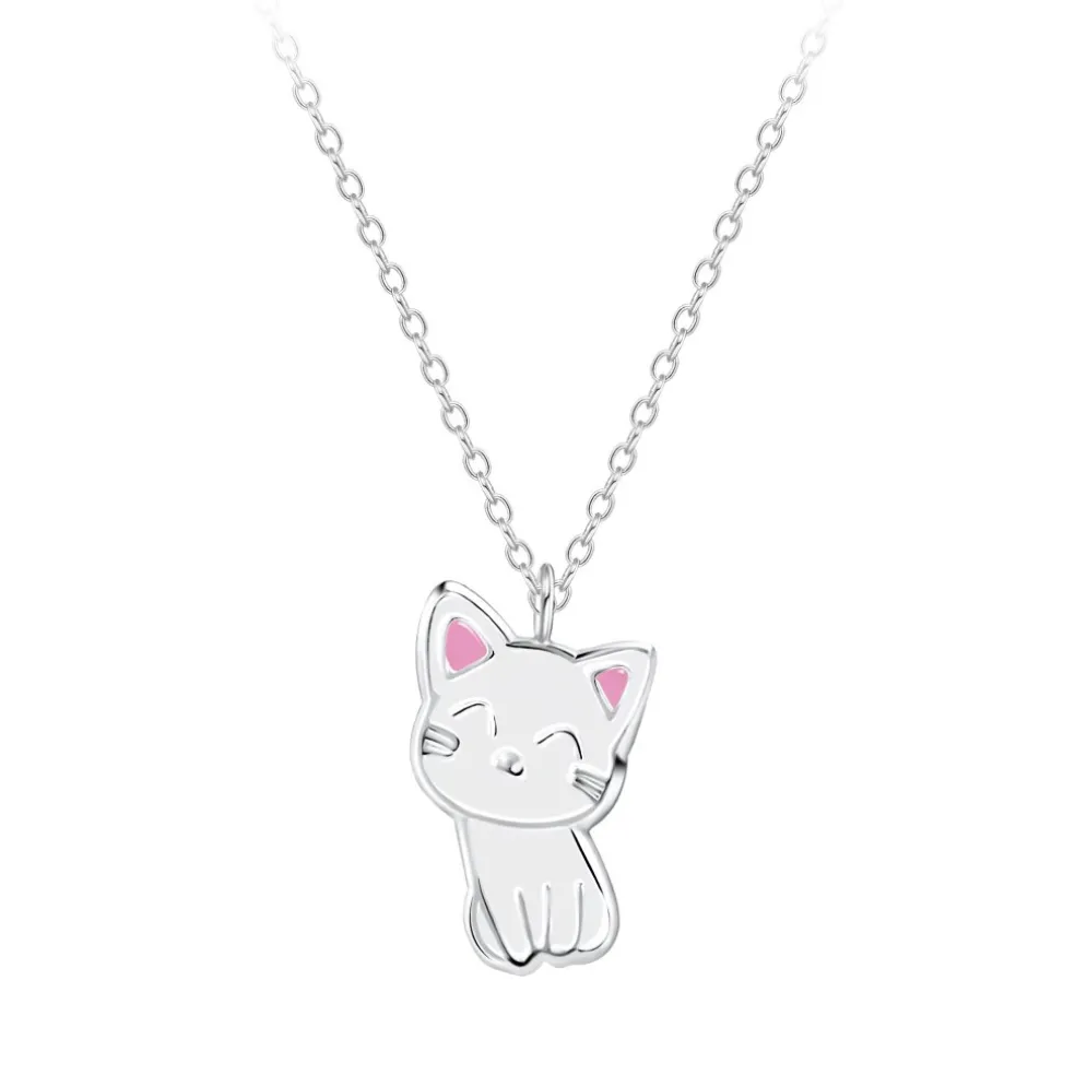 The Botildas Katt har ett finurligt leende som får hjärtat att dansa. Det här är ett halsband barn vill ha för att det är så fantasifullt och samtidigt fint att se på. Halsbandet är gjort av äkta silver och katten i vitt och rosa har färglagts med emalj.