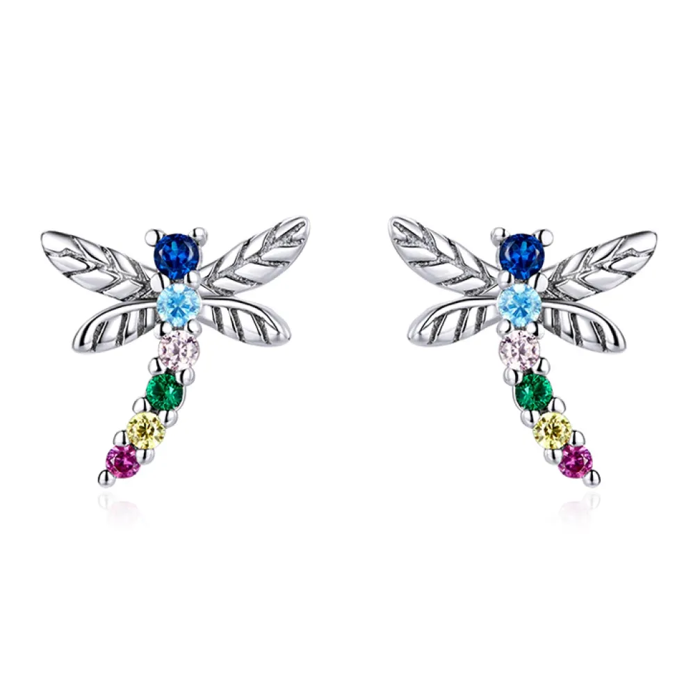 Örhängen i äkta silver i form av en trollslända, här med kristaller i mixade färger.