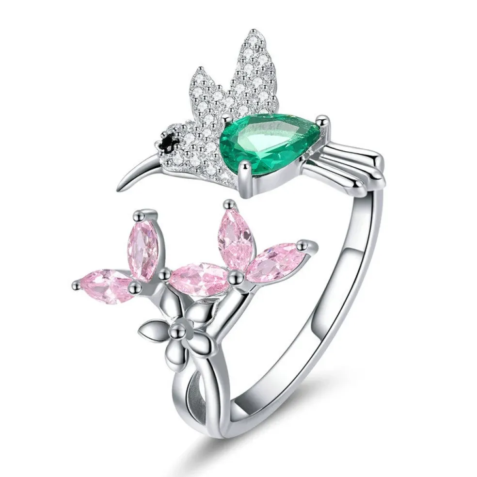 Ring tillverkad i äkta silver med vackert infattade cubic zirkonier i mixade färger, här i motivet med den lilla kolibrin på väg till nästa blomma för att njuta av dess nektar.