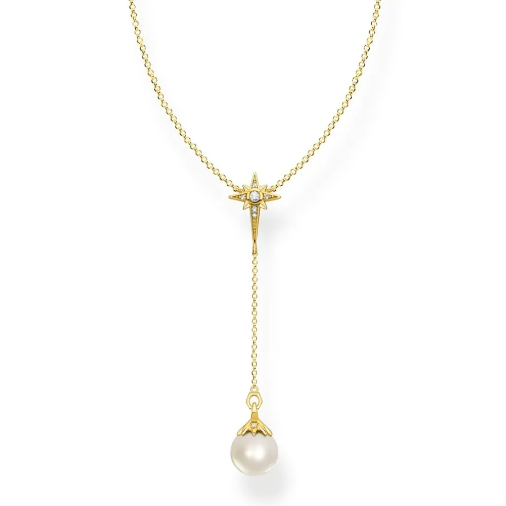 Y-halsband med äkta sötvattenspärla, stjärnelement och vita zirkoniastenar allt på kedja med plätering i 18 karat gult guld.