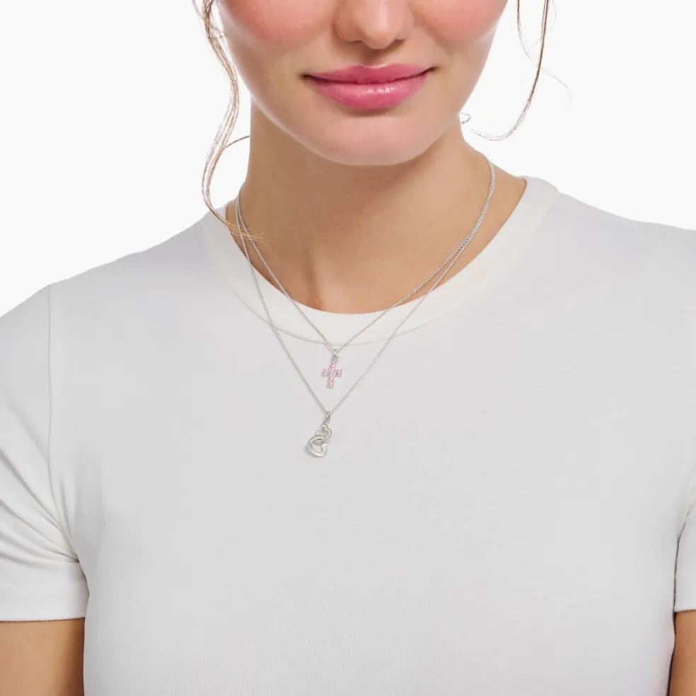 Hängsmycket består av två hjärtan som är sammanlänkade, vilket representerar det oskiljaktiga bandet mellan två själar. Ett av hjärtana är högglansigt polerat för en elegant look, medan det andra är utsmyckat med gnistrande vita, pavéinfattade zirkoniastenar för extra glans och skönhet.