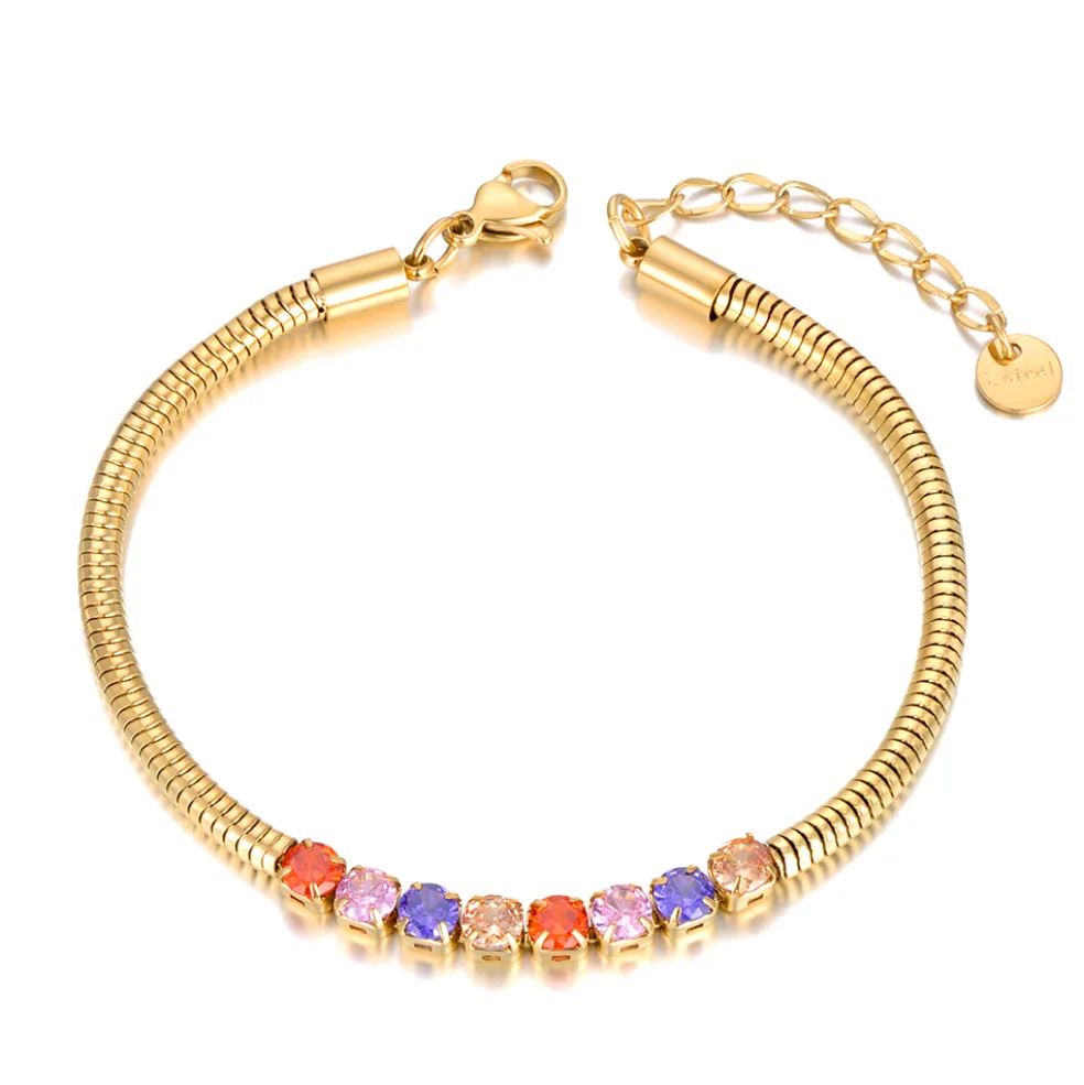 Armband i guldpläterat stål med totalt åtta stycken kristaller på, kristallerna är i mixade färger, modellen heter cubic och kommer från varumärket Anna K Jewelry.
