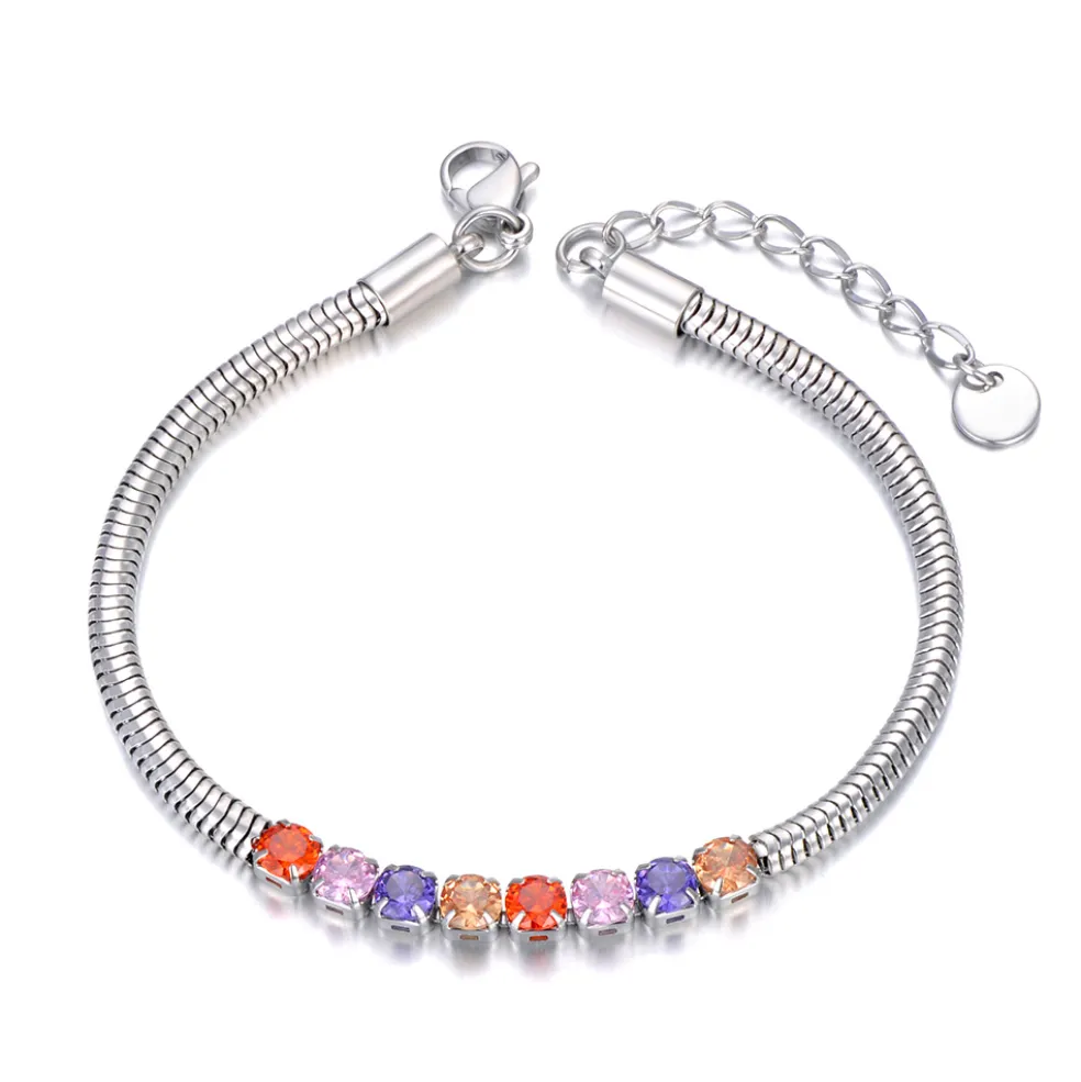 Armband i stål med totalt åtta stycken kristaller på, kristallerna är i mixade färger, modellen heter cubic och kommer från varumärket Anna K Jewelry.
