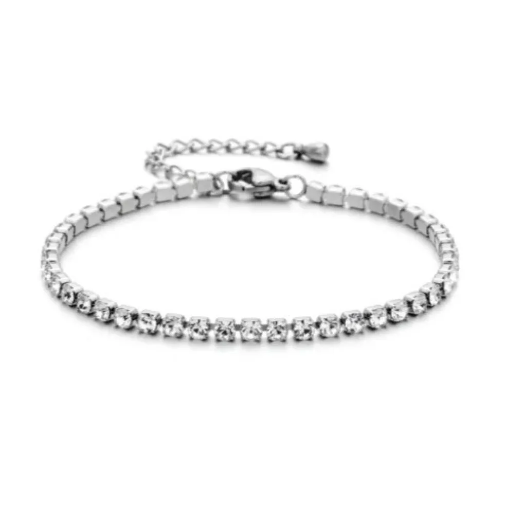Klassisk tennislänk, här som armband i hållbart stål med klara cubic zirkonia kristaller på. Varje liten kristall sitter elegant fäst med fyra små "klor" för bästa hållbarhet.