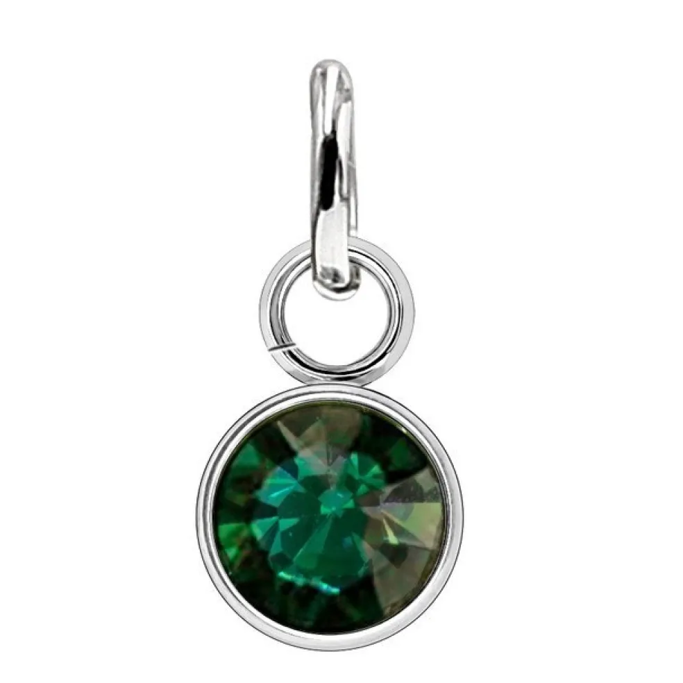 Liten berlock i stål med en mörkgrön kristall på, berlocken kommer från varumärket Anna K Jewelry och deras serie Birthstone.