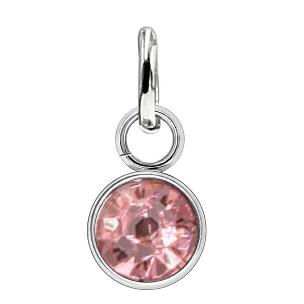 Liten berlock i stål med en ljusrosa kristall på, berlocken kommer från varumärket Anna K Jewelry och deras serie Birthstone.