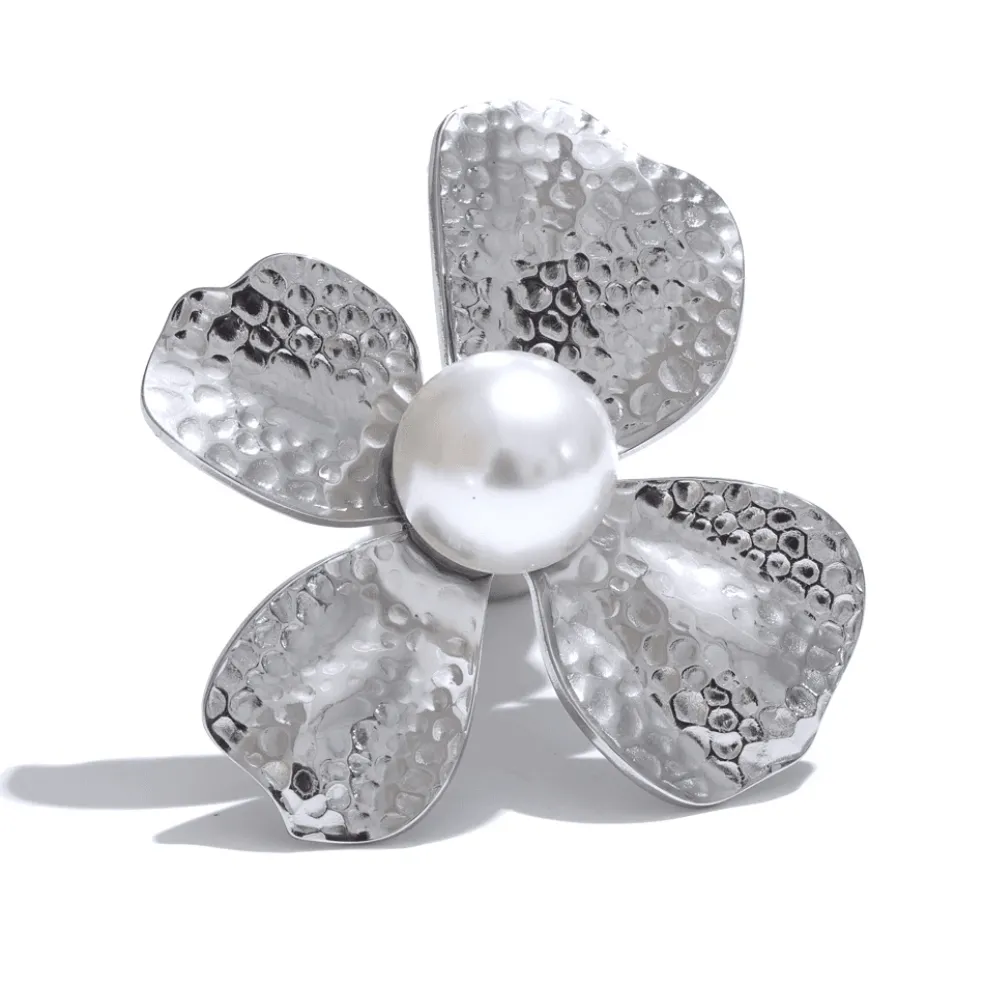 Denna silverfärgade brosch är formad som en stiliserad fyrbladig blomma, där varje blad är elegant utmejslat för att ge ett mjukt och harmoniskt intryck. I blommans mitt sitter en vacker vit pärla som fångar ljuset och tillför en tidlös elegans. Pärlans skimrande yta kontrasterar vackert mot den svala silverfärgen.