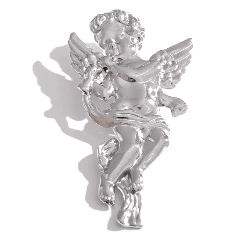 Denna silverfärgade brosch är en elegant och tidlös accessoar, formad som en detaljrikt utmejslad ängel. Med sina vingar och varsamt snidade ansiktsdrag utstrålar broschen både skönhet och fridfullhet, en symbol för beskydd och hopp. Perfekt att fästa på kavajslaget som en enkel detalj som förhöjer din stil. Den passar även utmärkt att fästa på mössan.