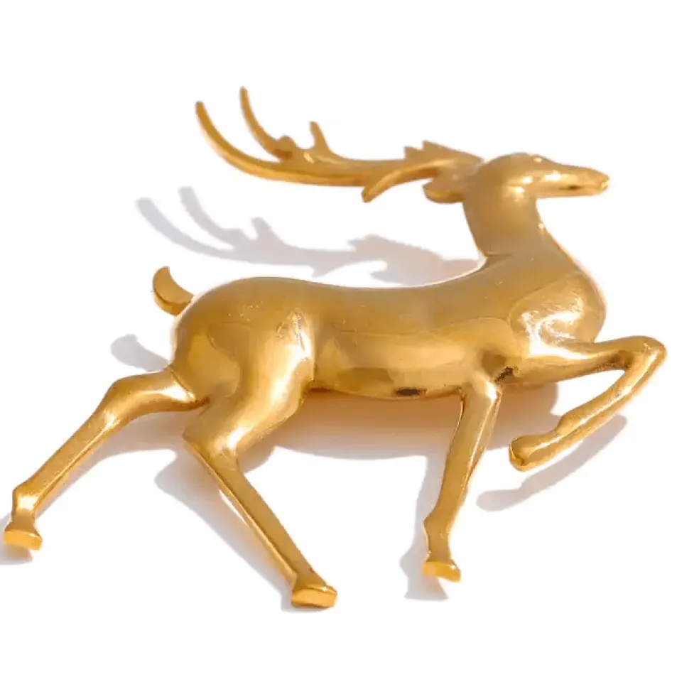 Denna ganska stora brosch i guldfärg föreställer en ståtlig hjort och blir en imponerande detalj på kavajslaget eller halsduken. Med sina utsökta detaljer, från de graciösa hornen till den eleganta kroppen, fångar broschen hjortens naturliga skönhet och kraft. Den varma guldfärgen ger ett kungligt skimmer som framhäver smycket oavsett omgivning.