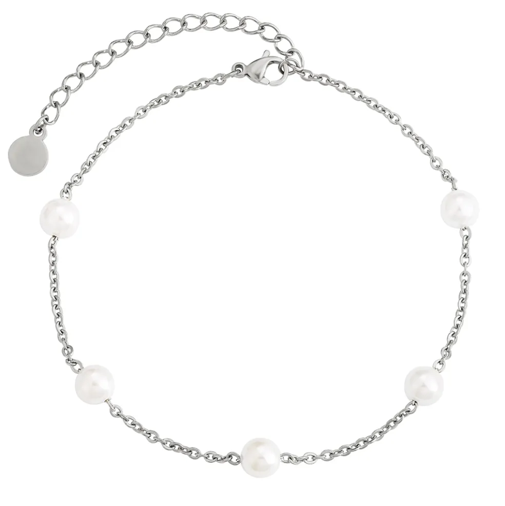 Fotlänk i rostfritt stål med fem små vita pärlor på.