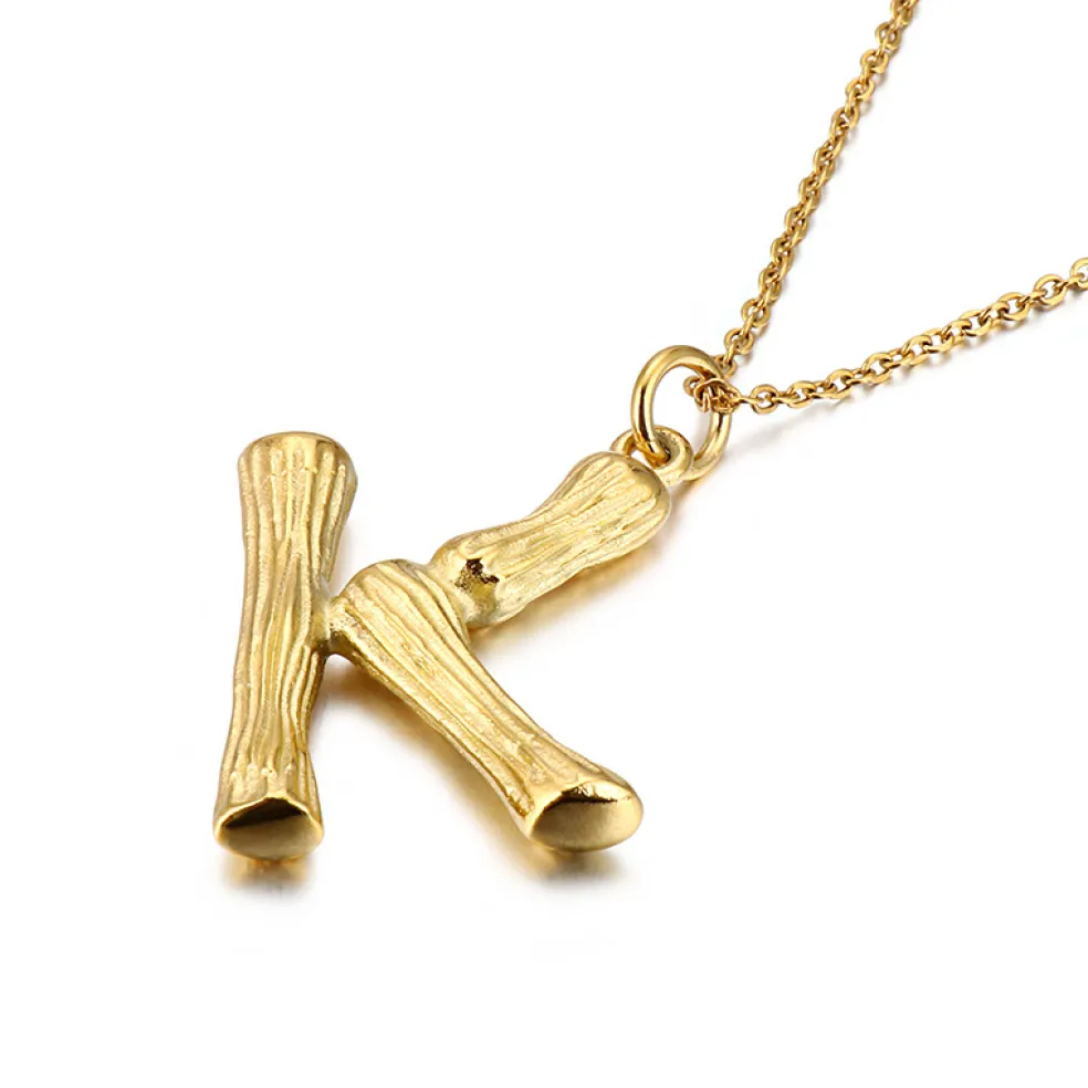 Guldpläterat stålhalsband och hänge med bokstaven K på. Bokstaven K har ett bambuliknande utseende.