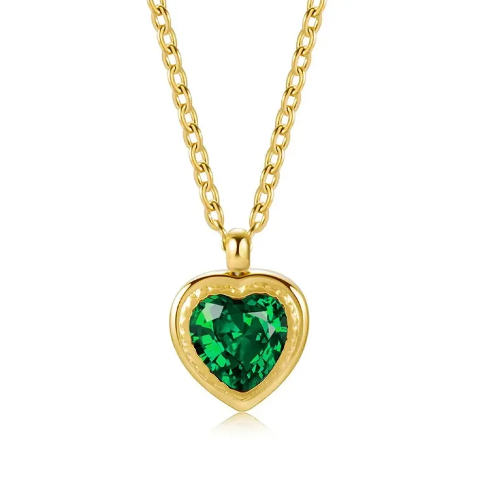 En nätt halskedja i guldpläterat stål med ett grönt hjärta som hänge, modellen kommer från varumärket Anna K Jewelry.
