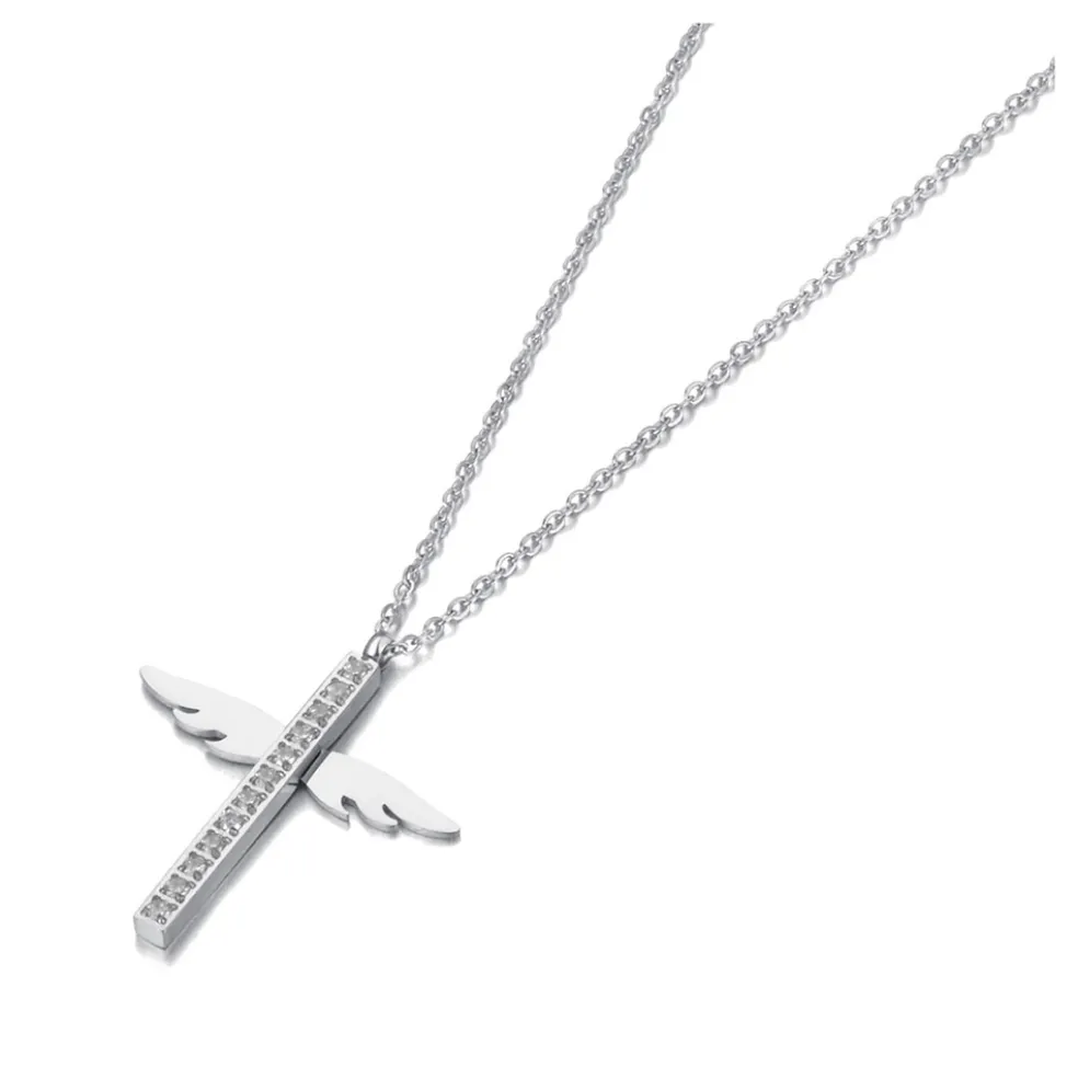 Stålhalsband med ett elegant kors i form av en vinge med en kristallklädd stav, kristallerna är klara, modellen kommer från varumärket Anna K Jewelry.