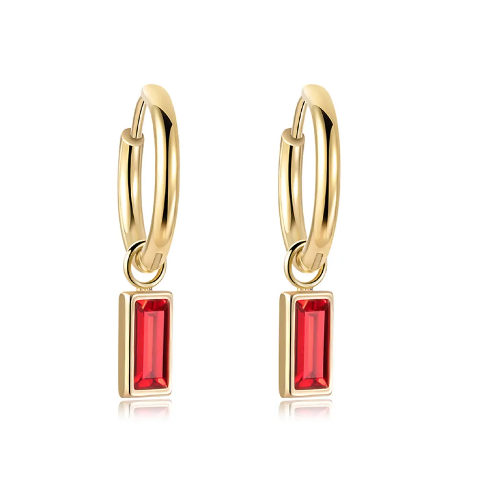 Ringörhängen i guldpläterat stål, här med hängande kristaller i rött.
