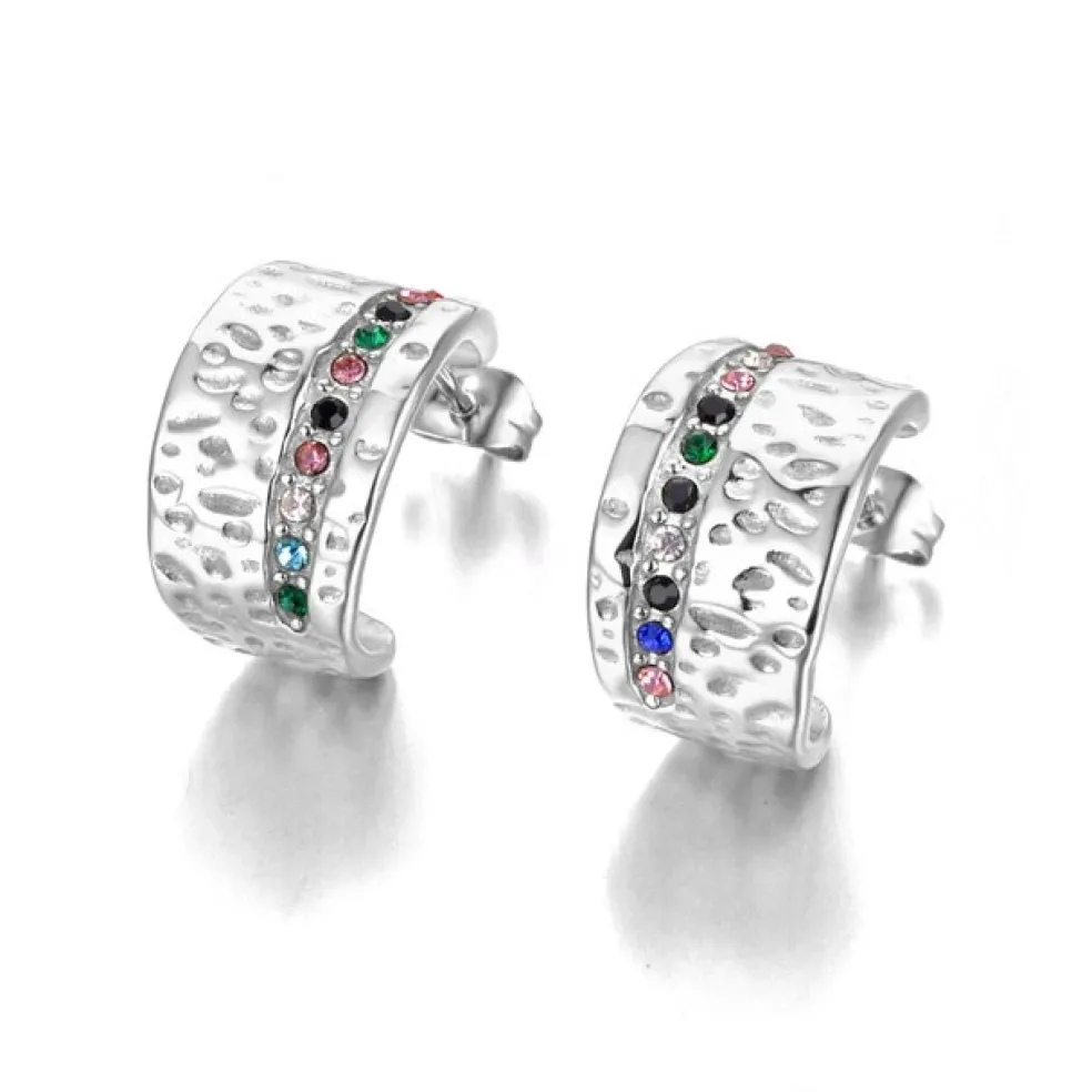 Riktigt fina örhängen i stål med hamrad yta och en rad kristaller i mixade färger, modellen heter Semicircle och kommer från varumärket Anna K Jewelry.