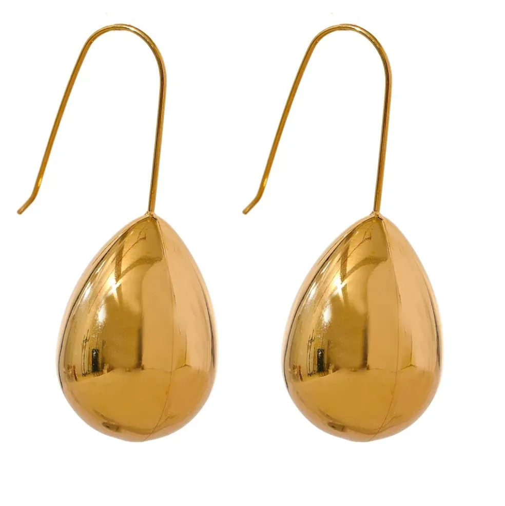 Utforska en poetisk elegans med dessa droppformade örhängen på långa krokar, vars form kan tolkas som både regndroppar eller en tår från ögat. Tillverkade av guldpläterat stål, bär de en subtil glans som fångar ljuset på ett förtrollande sätt.