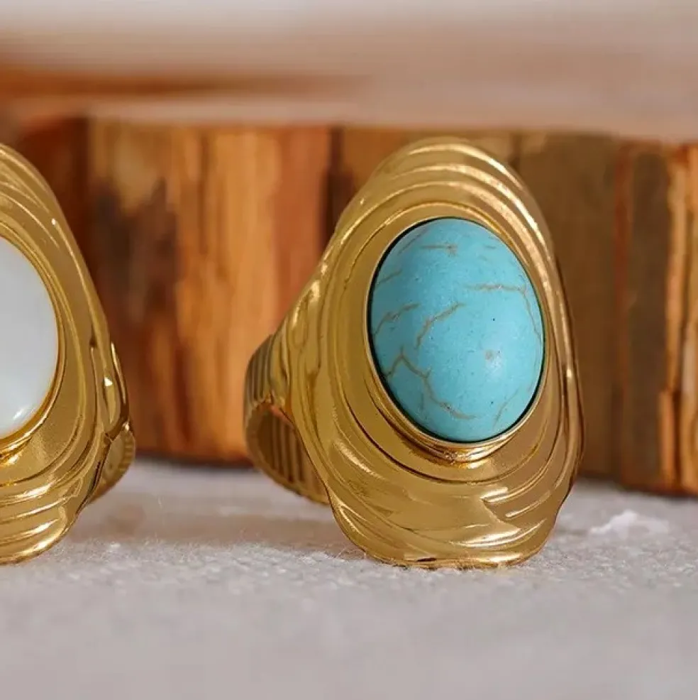 Snygg ring tillverkad i guldpläterat stål med en turkose sten på.