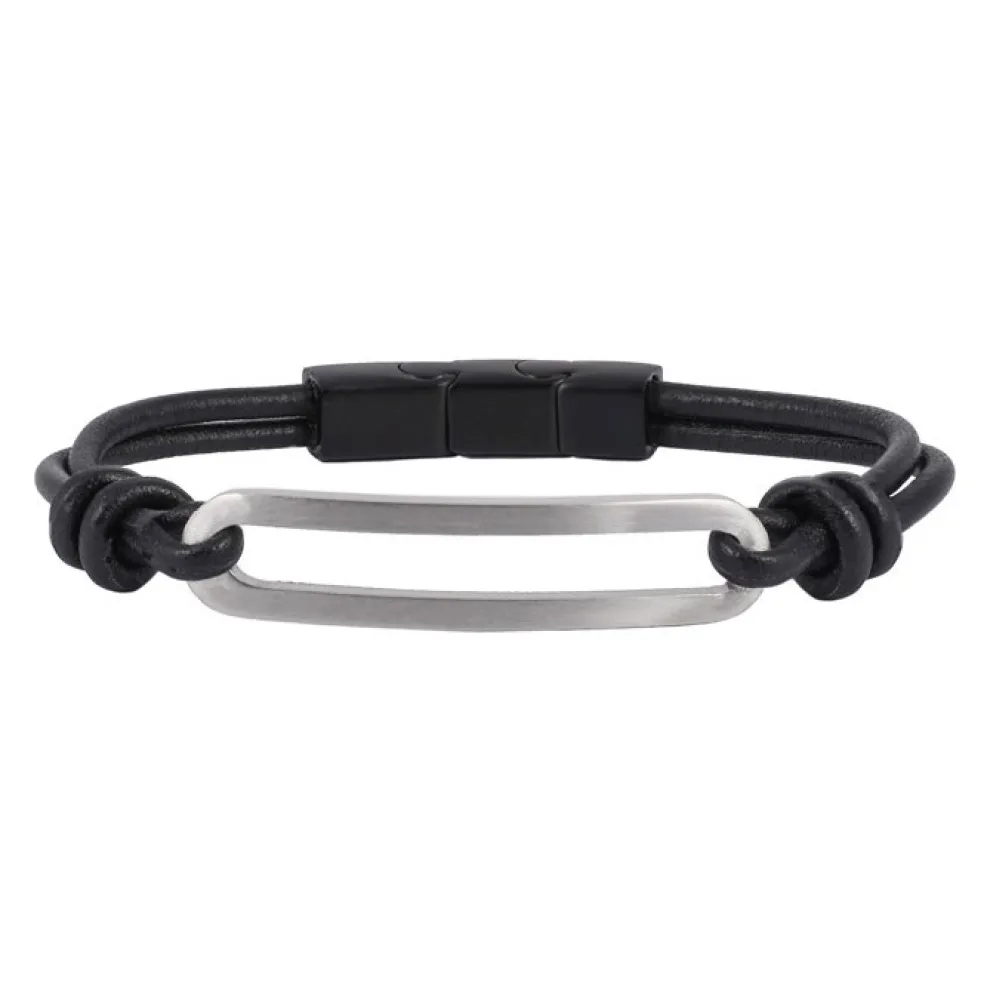 Svart läderarmband med knutar som håller en öppen oval ring i matt stål.