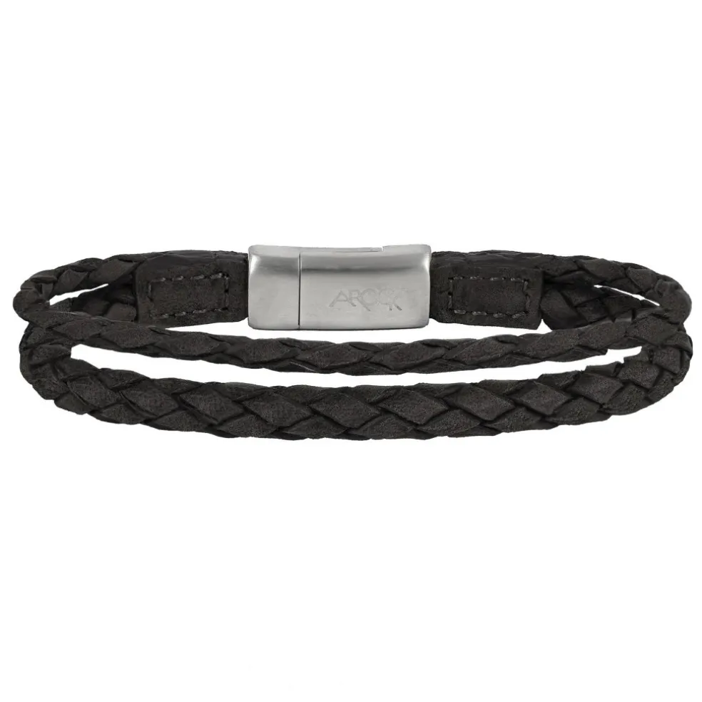 Smalt läderarmband med dubbla flätade läderband i svart, magnetlås i matt stål.