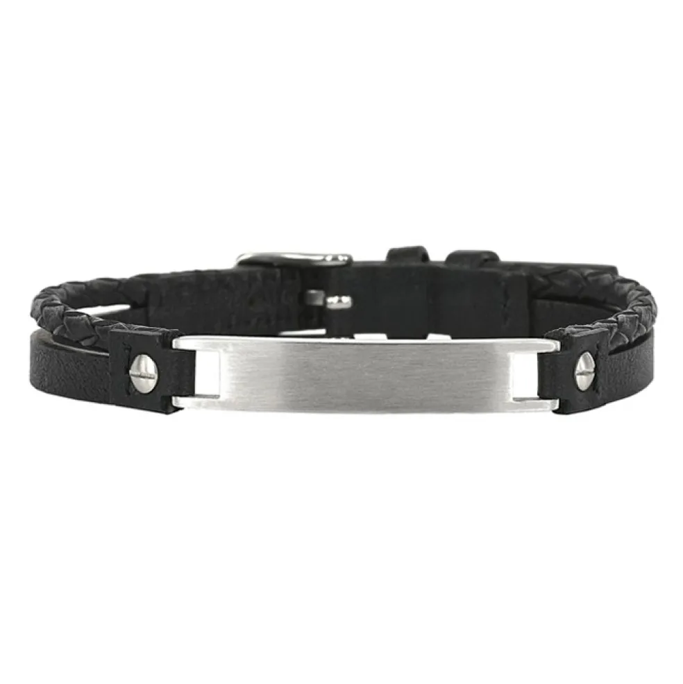 Ett smalt armband i svart läder och med en platta i matt stål, som passar utmärkt för gravyr.