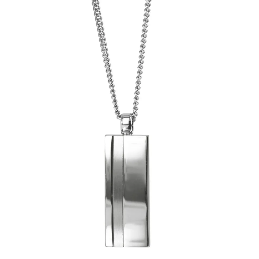 Stålhalsband i en 3 mm bred länk med ett rektangulärt hänge. Hänget har en blank finish med en matt rand.