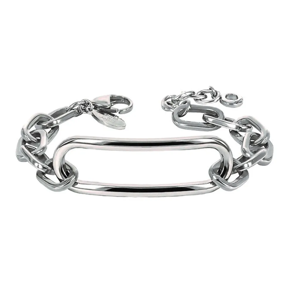 Länk med platta och ovala ringar med stor oval ring som detalj mitt fram, här i rostfritt stål.