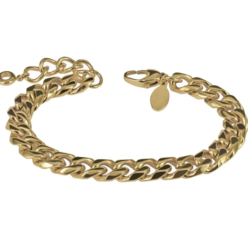 Bred pansarlänk i guldpläterat stål, här som armband. Modellen heter Hailey och kommer från varumärket Astrid&Agnes.