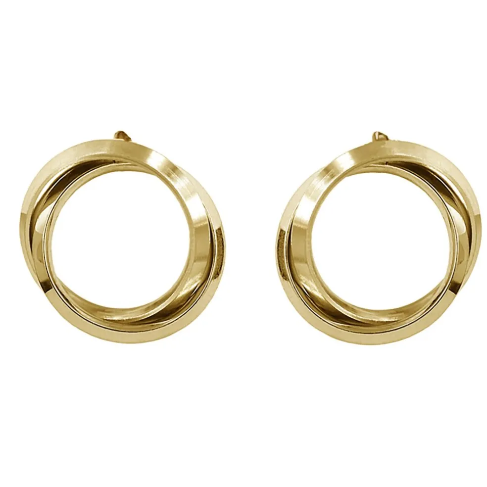 Ett par örhängen med två sammanlänkade cirklar på, här i guldpläterat stål. Modellen kommer från varumärket Astrid & Agnes och deras populära serien Carolin.