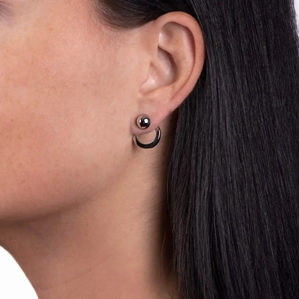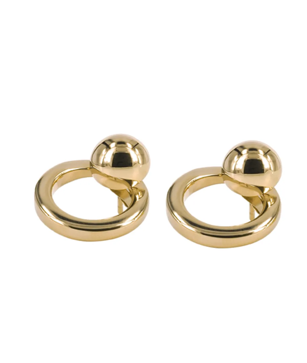 Denna modell kallas Ear Jacket där ringen fästes på baksidan av örat och den halva bollen fästes på framsidan av örat. Örhänget kommer från varumärket Astrid&Agnes och är tillverkat i guldpläterat rostfritt stål.
