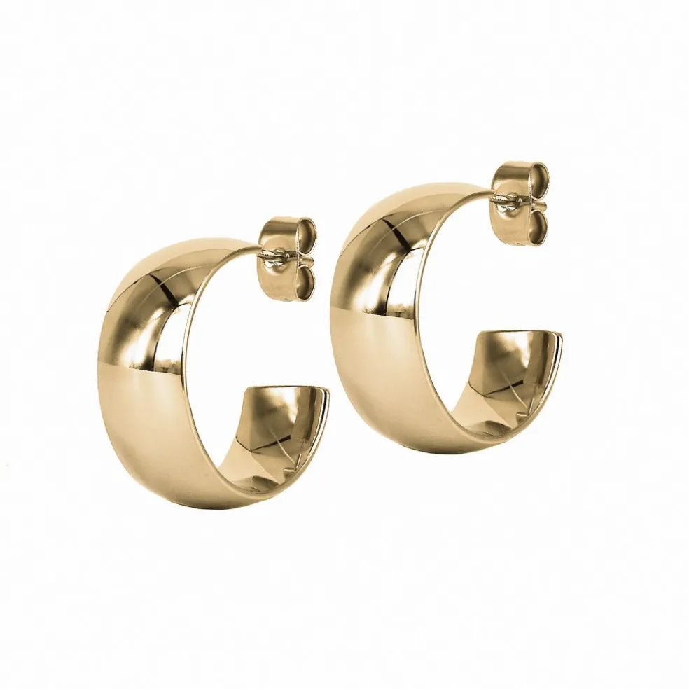 Breda creolörhängen med mjukt rundad yta i 14 karats guldpläterat stål. Denna modell finns i flera storlekar, detta är storlek Medium.