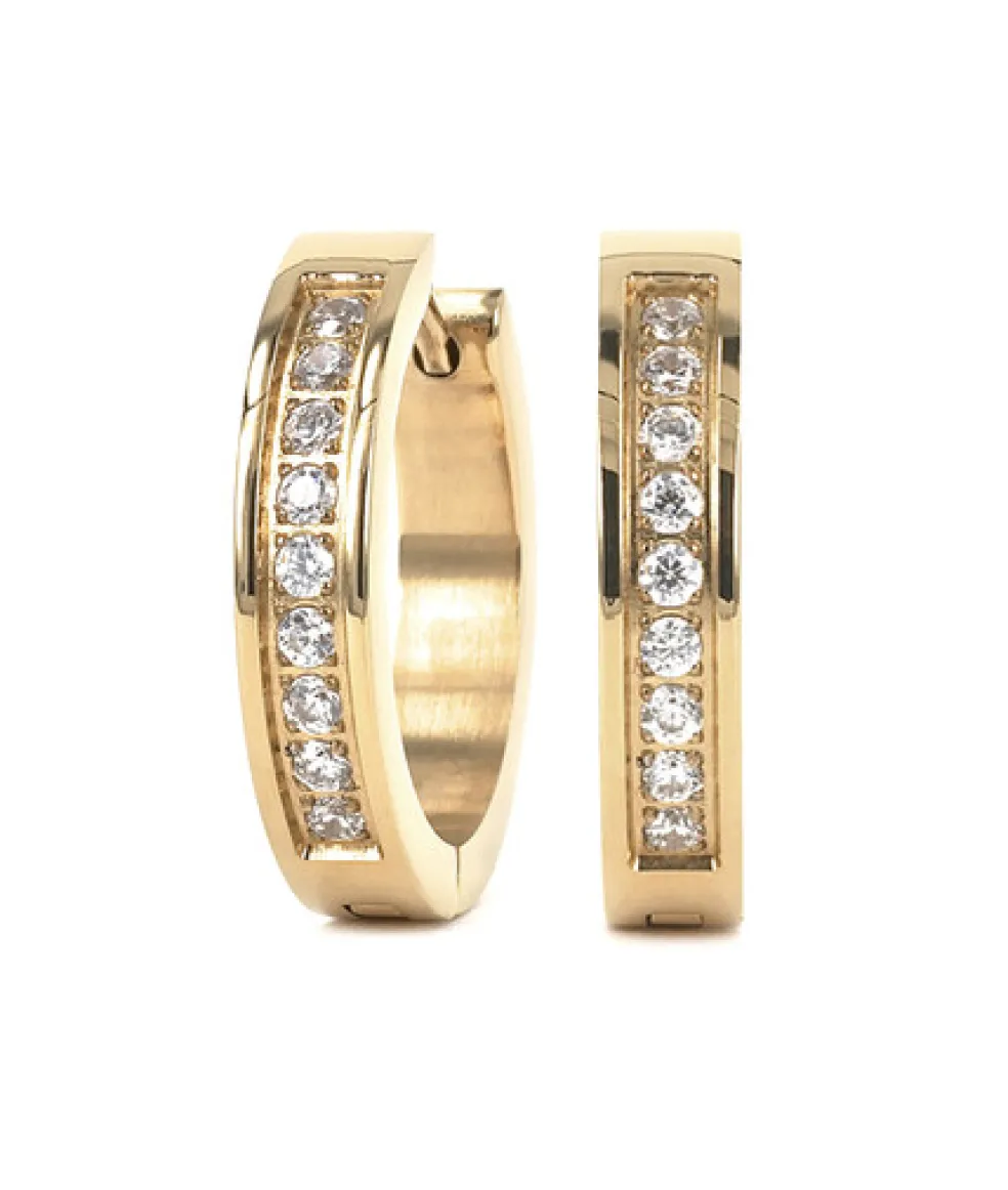 Creoler i guldpläterat stål där halva örhänget är klätt med en rad små kristaller från varumärket Astrid & Agnes.
