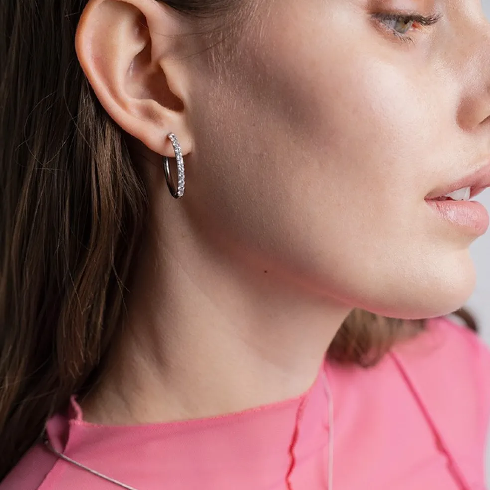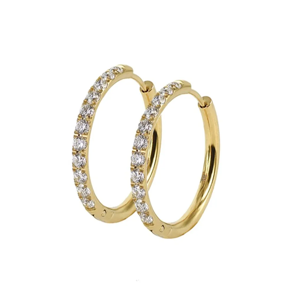 Blanka creolörhängen i guldpläterat stål med klara cubic zirconier på, örhänget kommer från varumärket Astrid & Agnes, modellen heter Lucy och ses här i 2,5cm storlek.