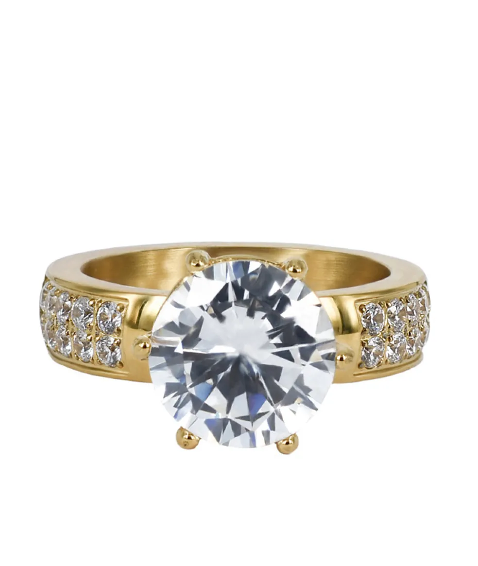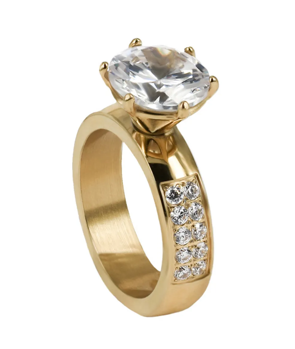 Ring i blankt guldfärgat stål med en stor vacker och gnistrande kristall på, samt tio små kristaller infattade i ringskenan på vardera sida av den stora kristallen.
